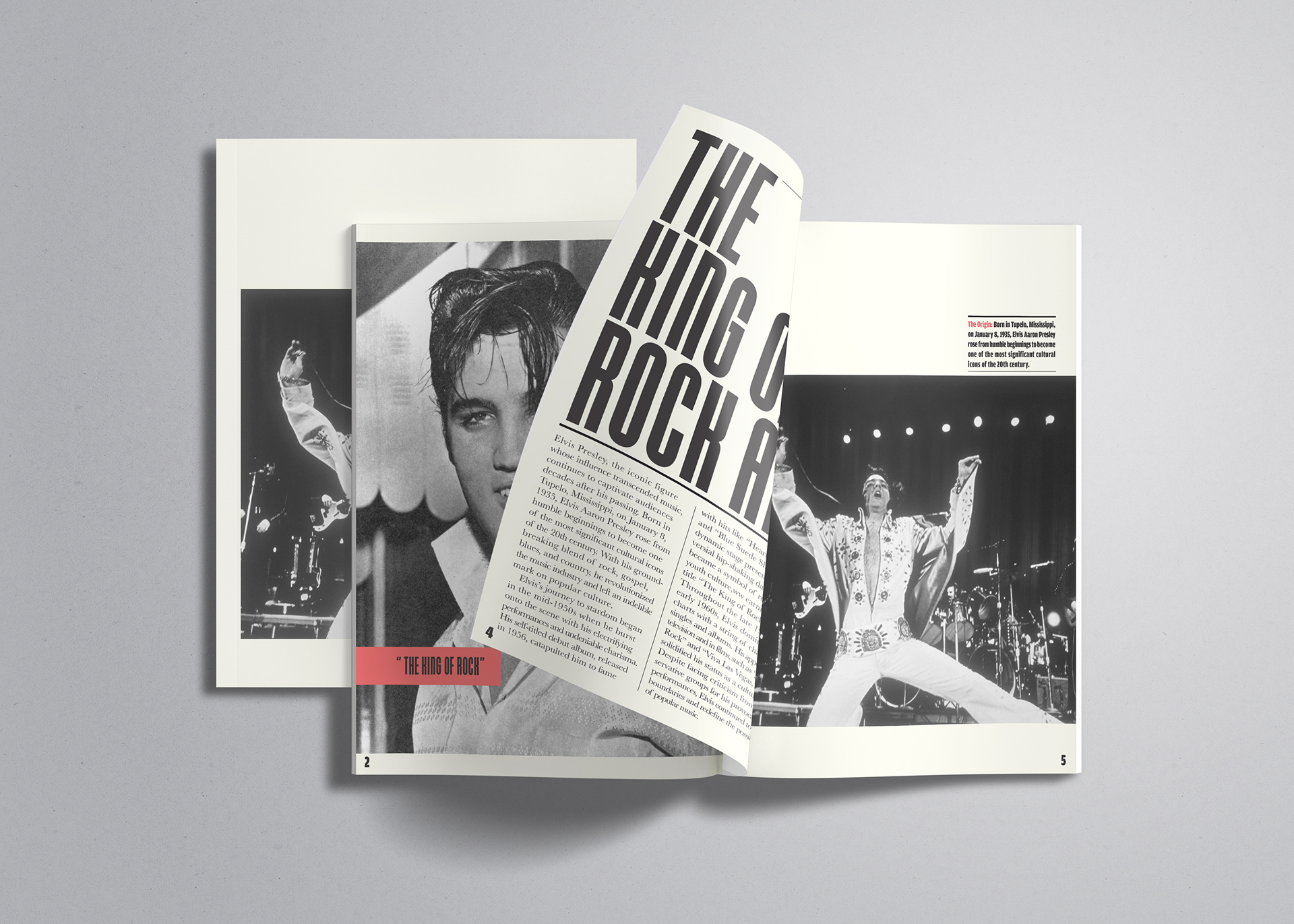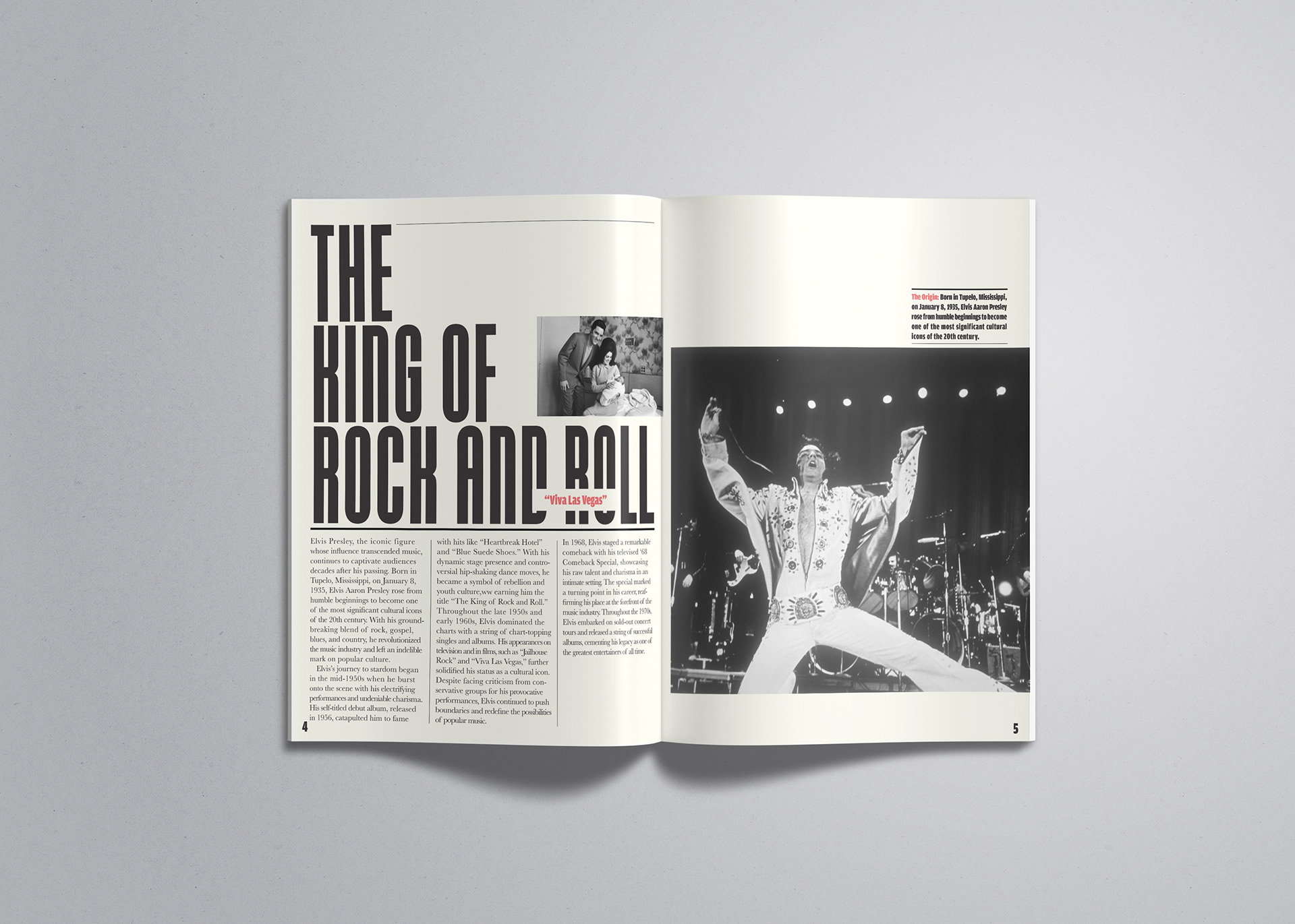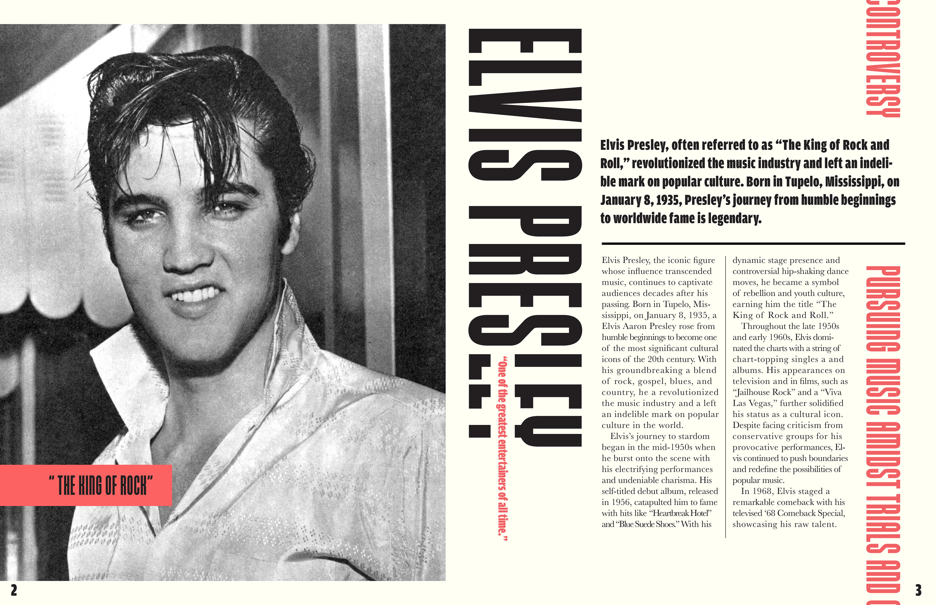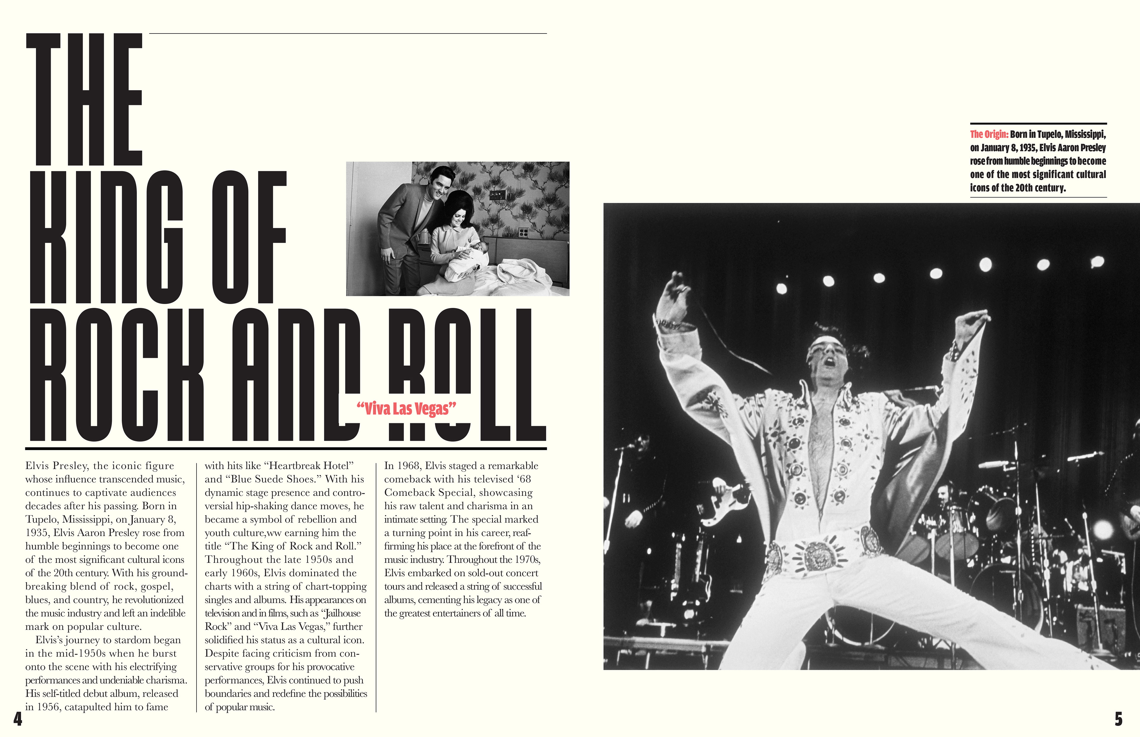 This short two-page editorial highlights the life, influence, and cultural impact of Elvis Presley. The layout combines bold, oversized typography with striking black-and-white photography to reflect both his commanding stage presence, and lasting legacy.