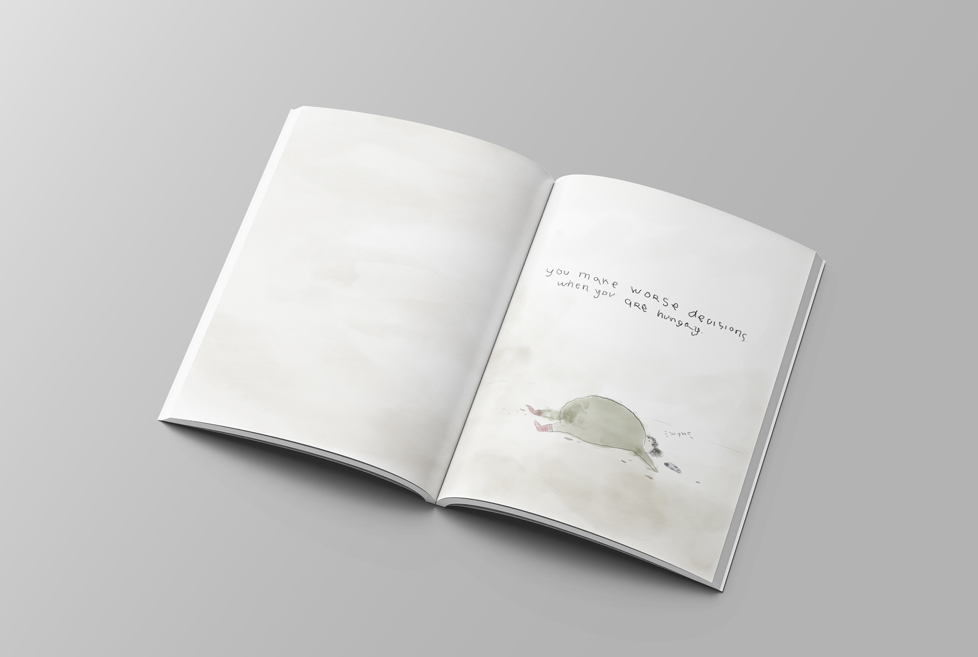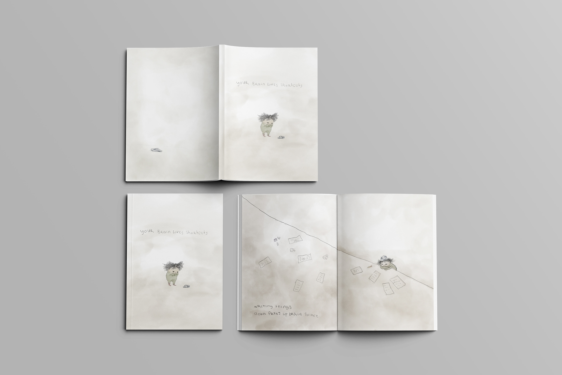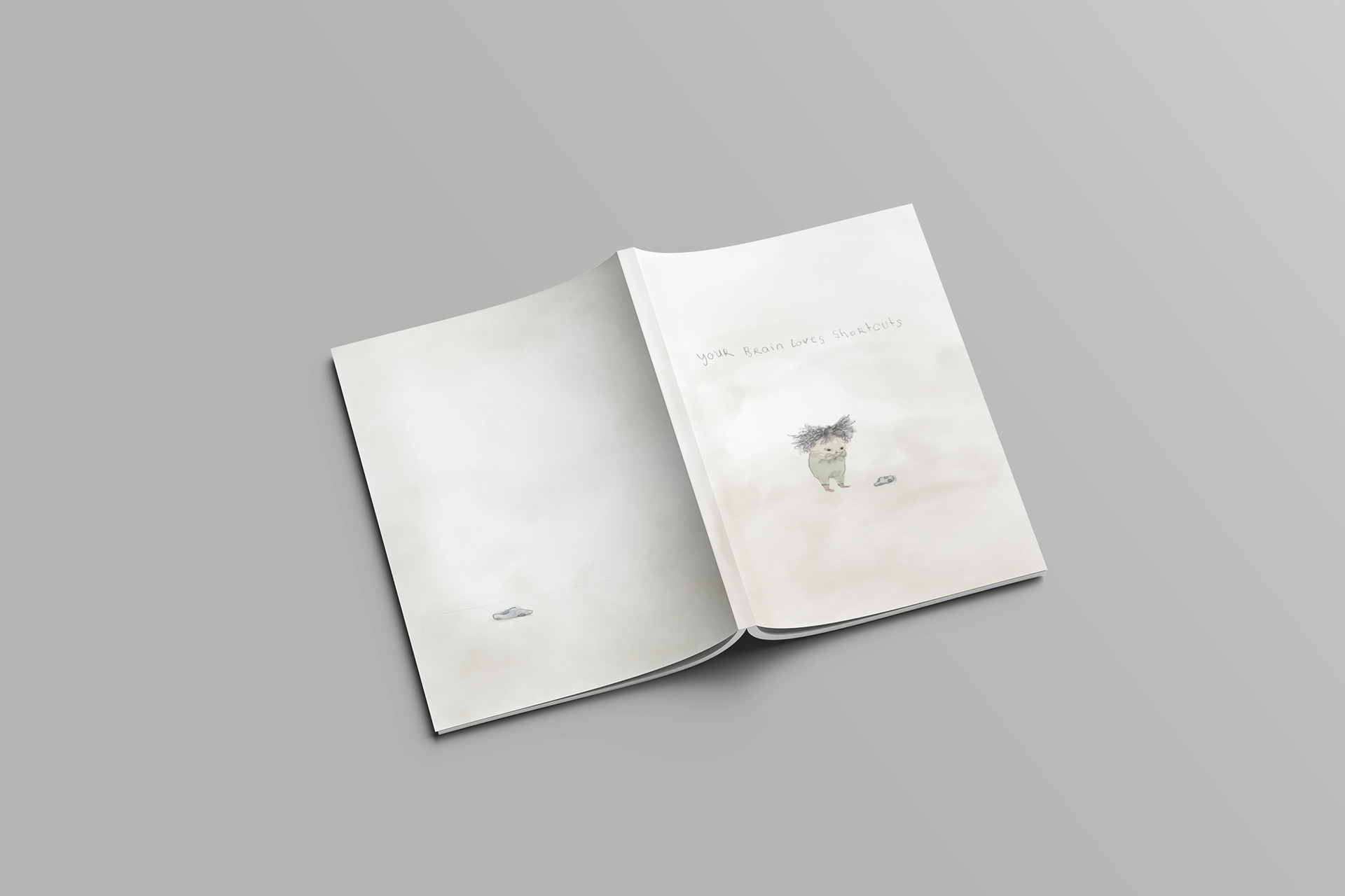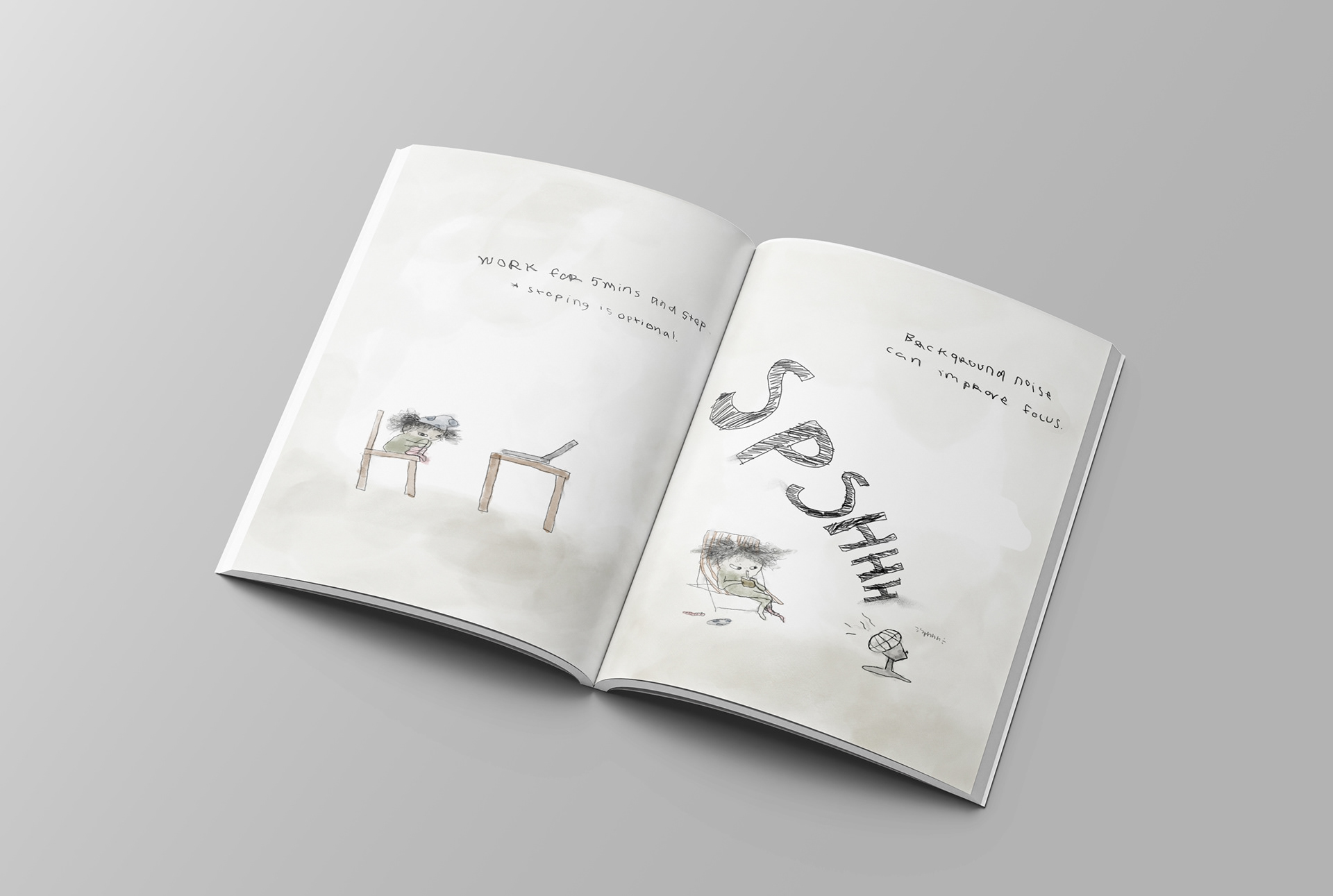 This small-format look book explores the science behind “laziness” through playful, hand-drawn illustrations, and short brain-based facts. Each spread pairs simple neurological insights: such as how repetition fades into the background, why we make worse decisions when we’re hungry, or how writing things down frees up mental space.