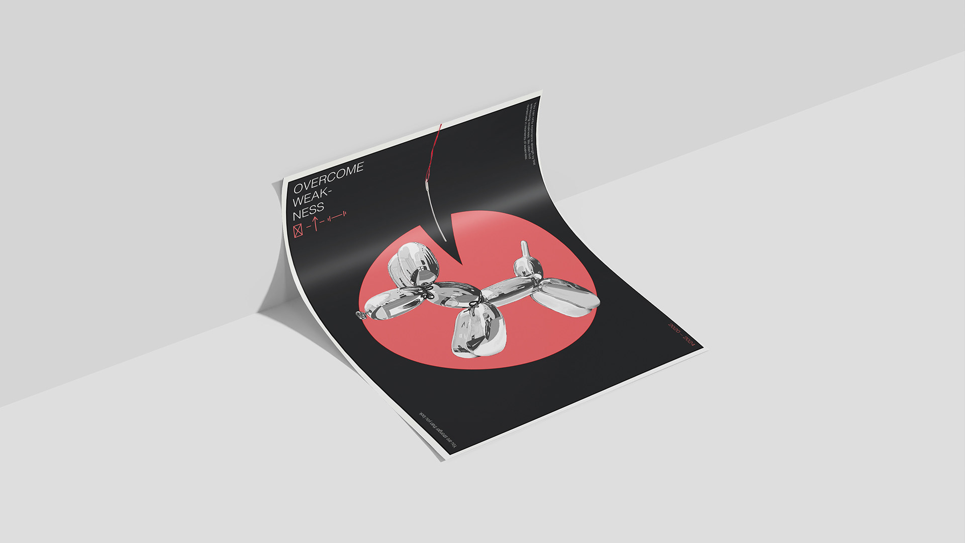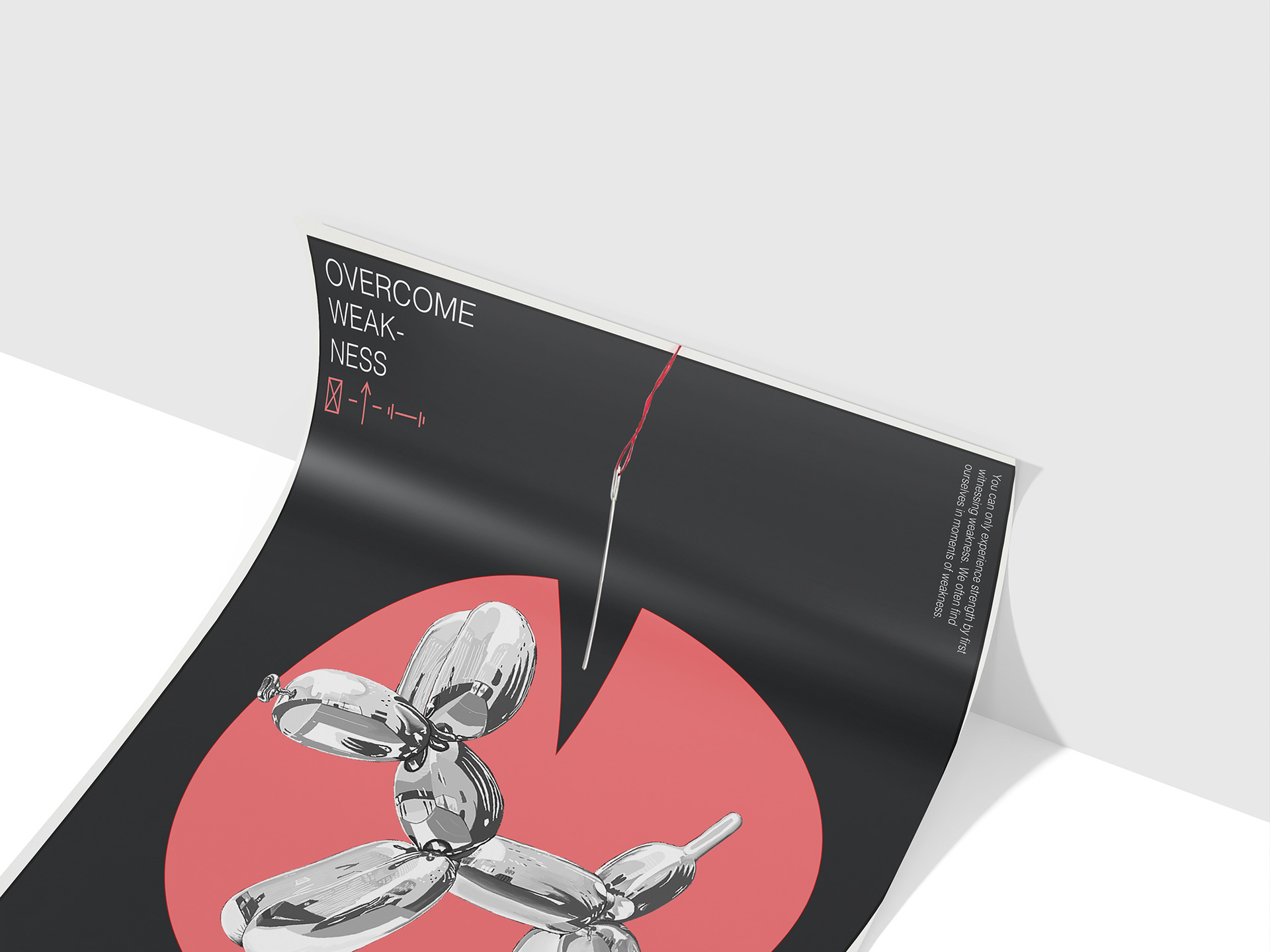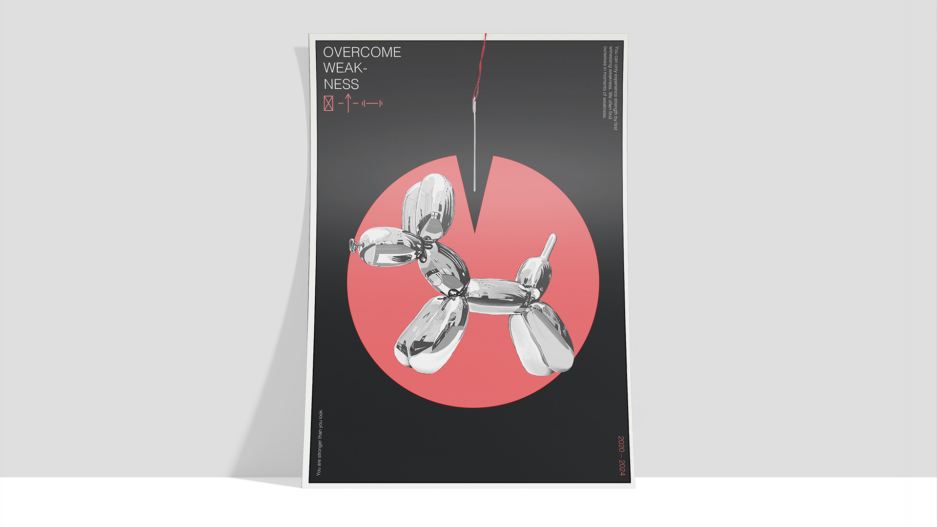 This personal poster explores themes of perception, resilience, and internal strength through symbolic imagery and minimal composition. The reflective metallic balloon form sits beneath a suspended needle, creating tension between fragility and durability.